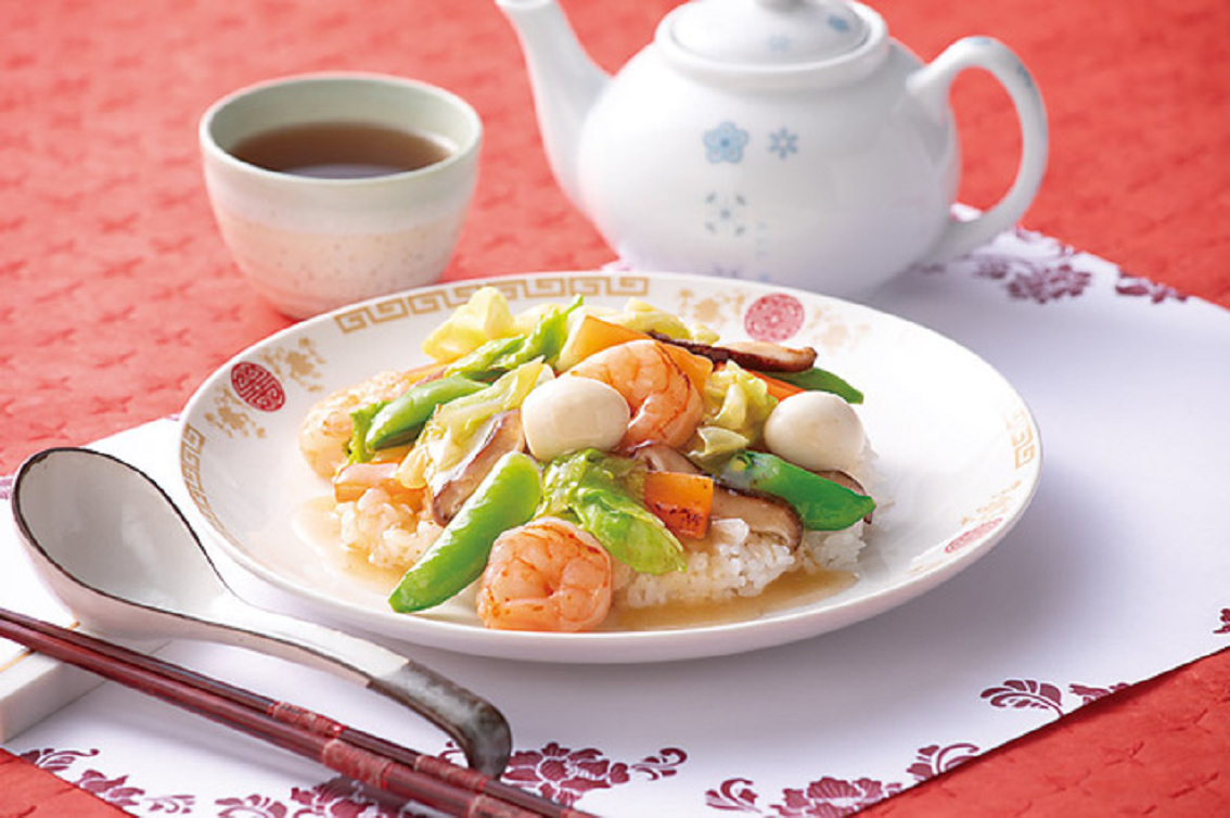 #丼ぶり#うずらの卵#カンタン酢#春#しいたけ#えび#にんじん#中華風#キャベツ