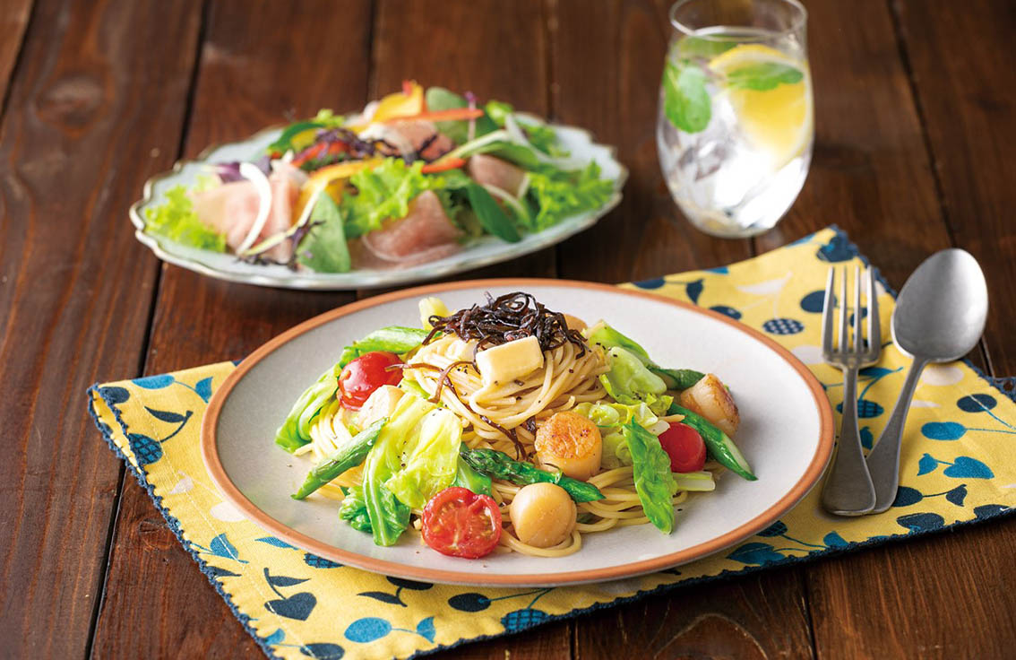 ほたてと春キャベツの塩こんぶパスタ