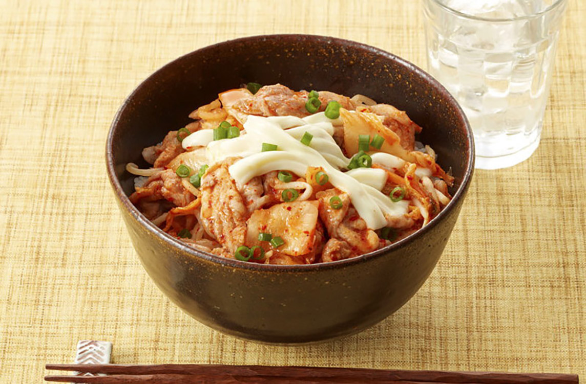 #丼ぶり#豚こま#もやし#電子レンジ#丼#キムチ#チーズ#簡単