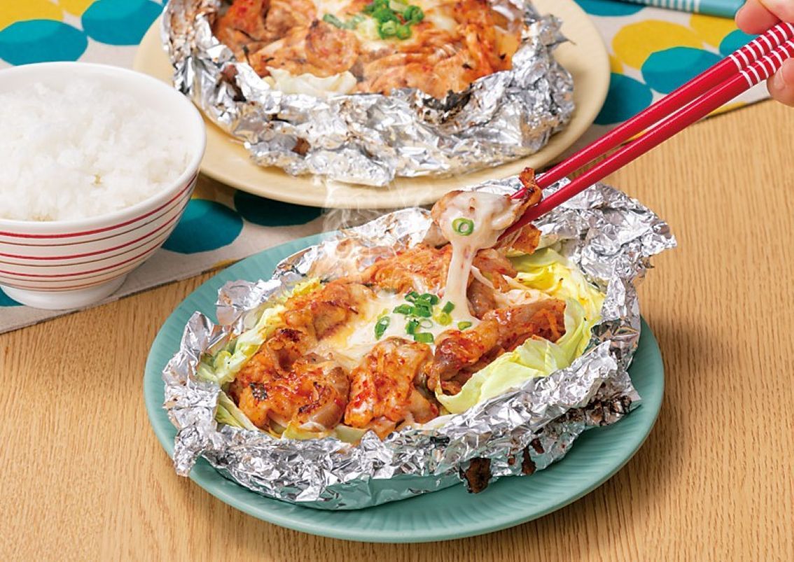 #アルミホイル#たまねぎ#長ねぎ#キャベツ#豚肉#キムチ#チーズ
