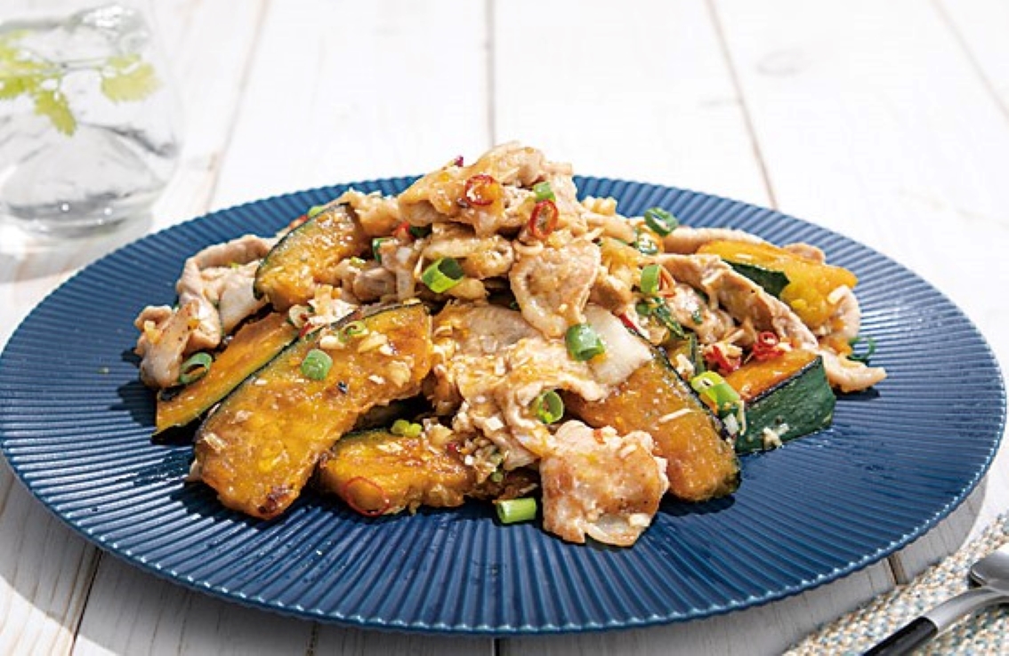 #香味ソース#みょうが#かぼちゃ#長ねぎ#豚肉