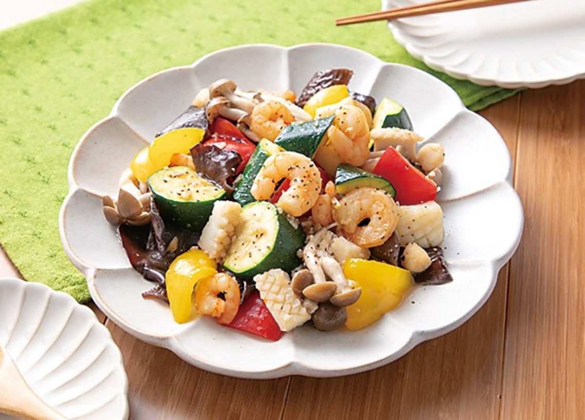 #シーフードミックス#きくらげ#パプリカ#炒め物#ズッキーニ#夏野菜