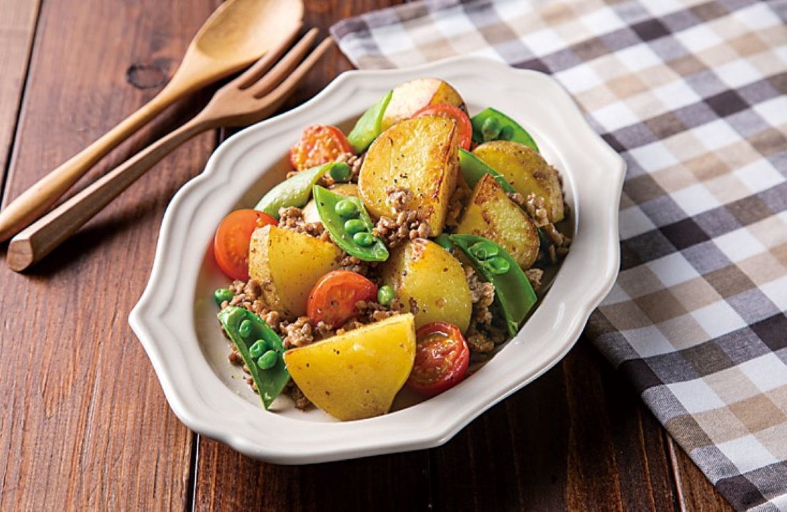 #カレー風味#スナップエンドウ#挽肉#じゃがいも#ミニトマト