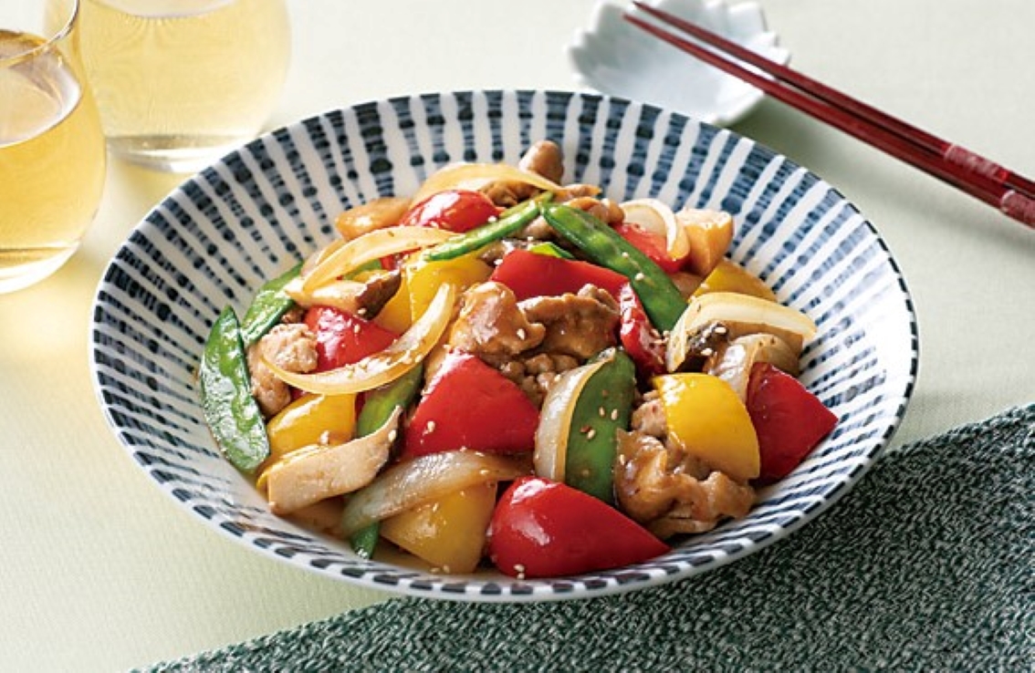 #オイスターソース#たまねぎ#春野菜#パプリカ#エリンギ#さやえんどう#豚肉