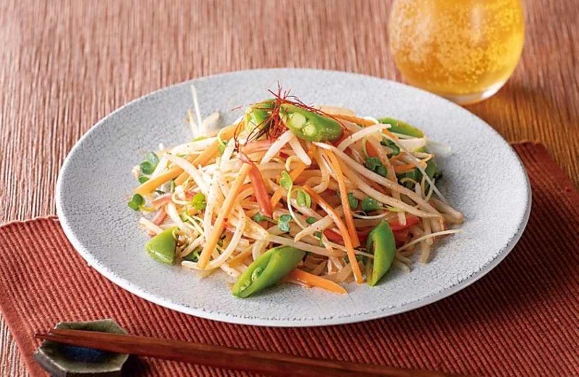 #かいわれ大根#スナップエンドウ#カニカマ#もやし#電子レンジ#にんじん#おつまみ