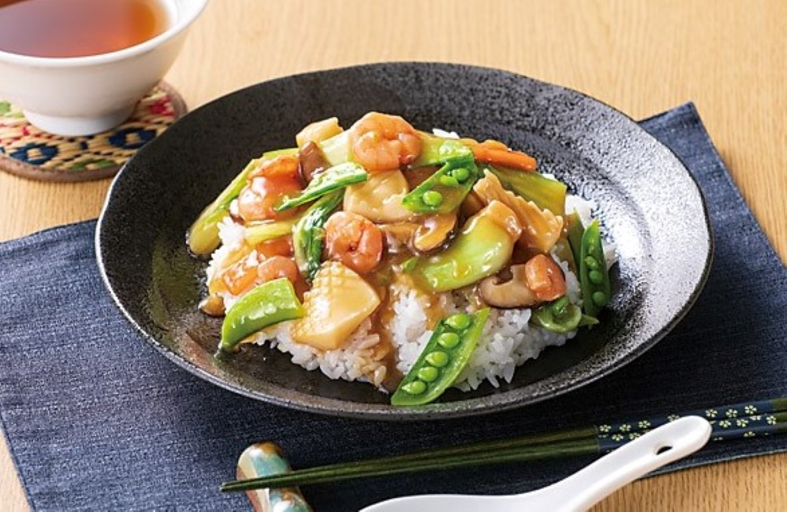 #五目うま煮#丼もの#シーフードミックス#スナップエンドウ#あんかけ#チンゲン菜#白菜#ご飯