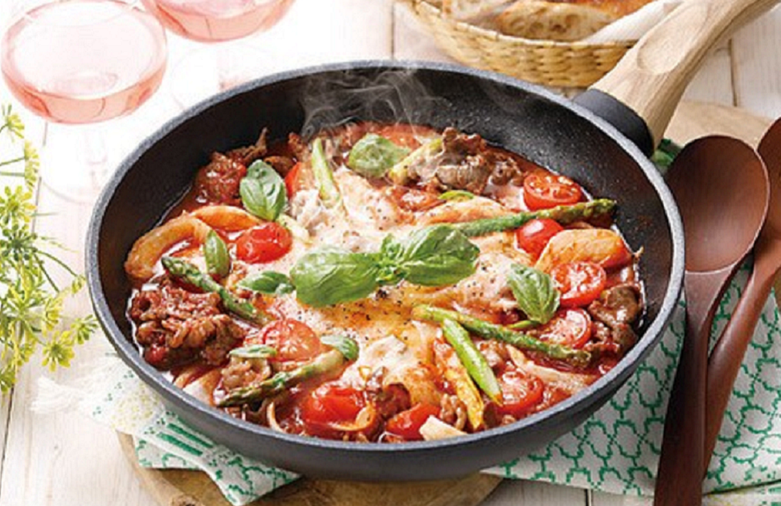 #トマト缶#ワンパン#アスパラ#トマトソース#玉ねぎ#ピザ#トマト#チーズ#牛肉