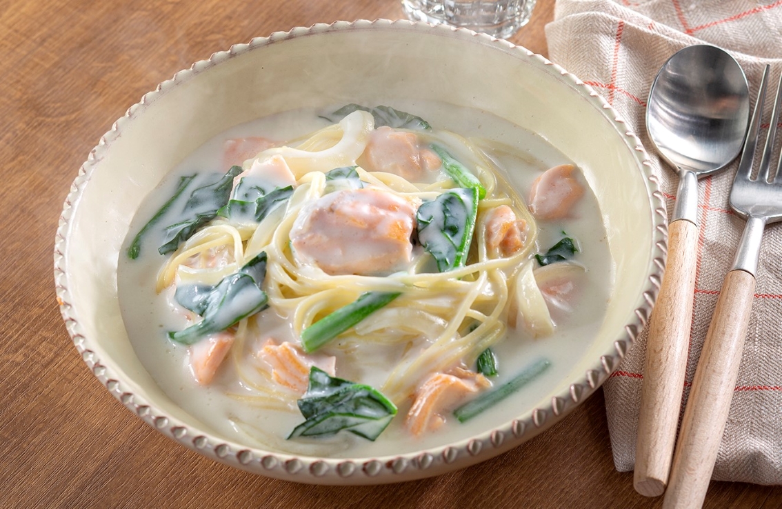鮭とほうれん草のクリーミースープパスタ