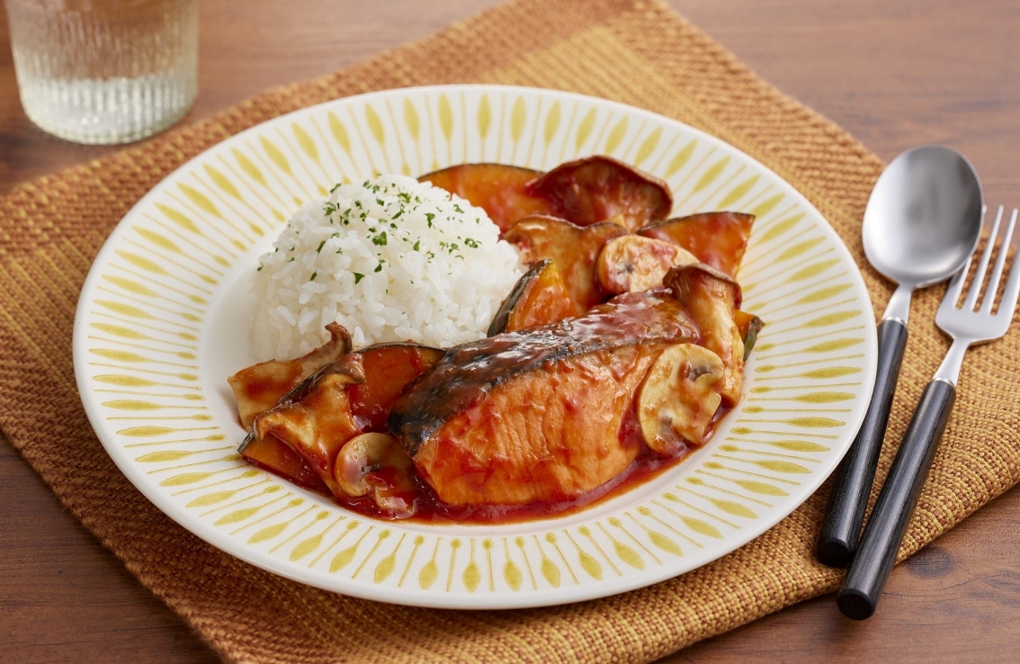 鮭と秋野菜の完熟トマトガーリックソース