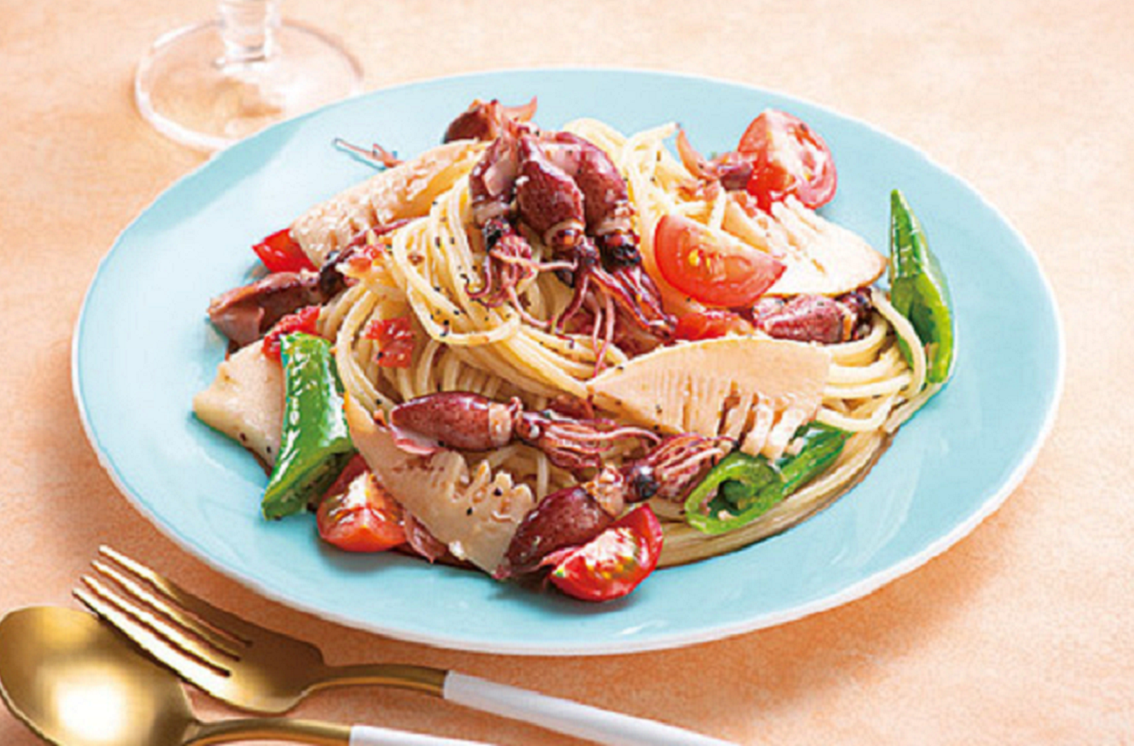 #めんつゆ#白ワイン#ほたるいか#スナップエンドウ#春#たけのこ#パスタ#トマト
