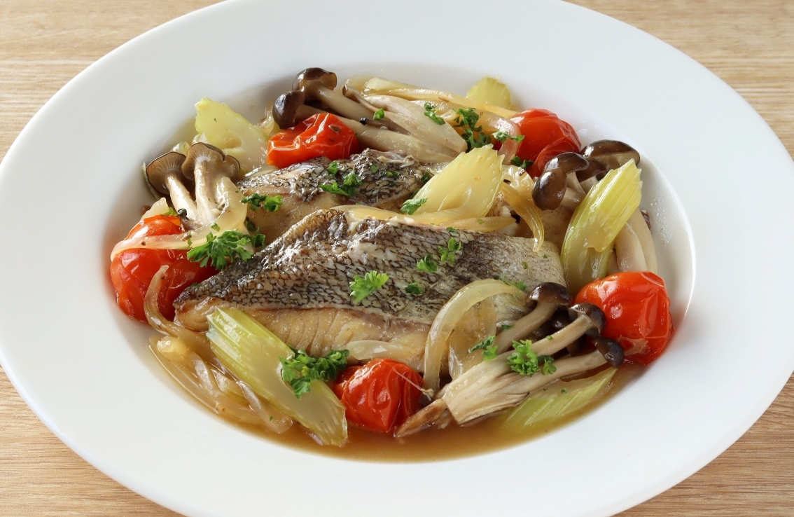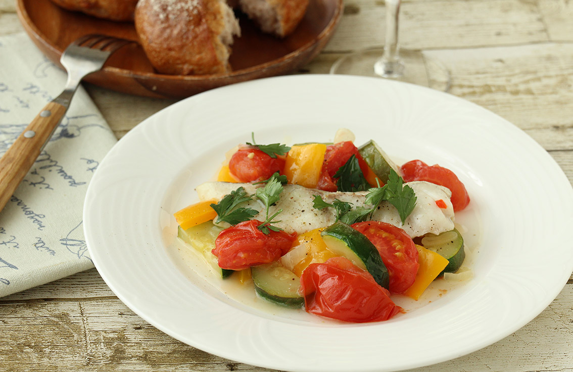 夏野菜と白身魚の白ワイン蒸し