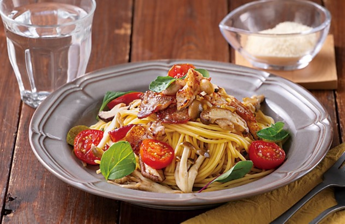 #生しい茸#コンソメ#スパゲッティ#きのこ#舞茸#ぶなしめじ#ミニトマト
