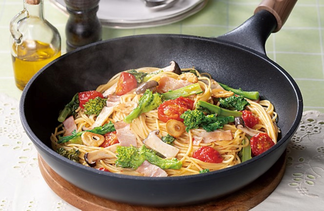フライパンひとつで!菜の花とトマトのペペロンチーノ
