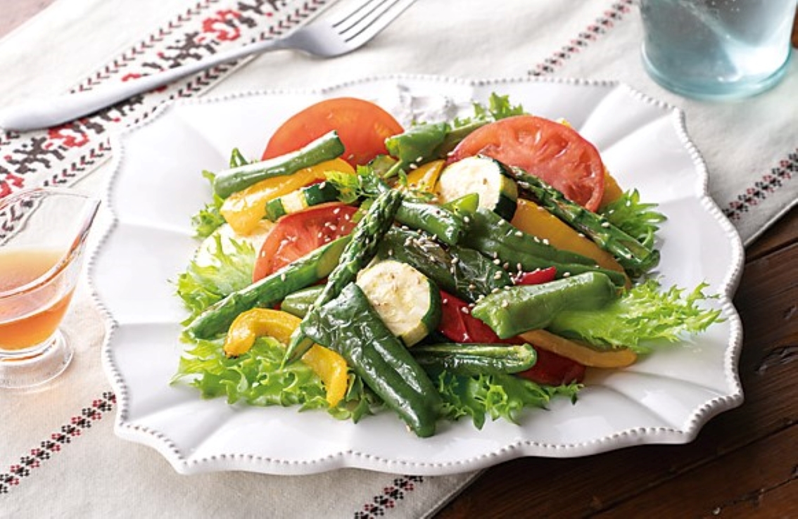 #フリルレタス#パプリカ#ピーマン#アスパラガス#オリーブオイル#トマト#ズッキーニ#サラダ
