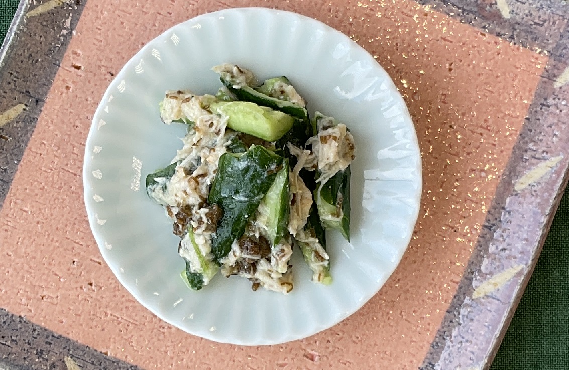 ②①に『沖縄産もずくスープ』・『とりささみフレーク』を入れて軽くもみ味をなじませる。
